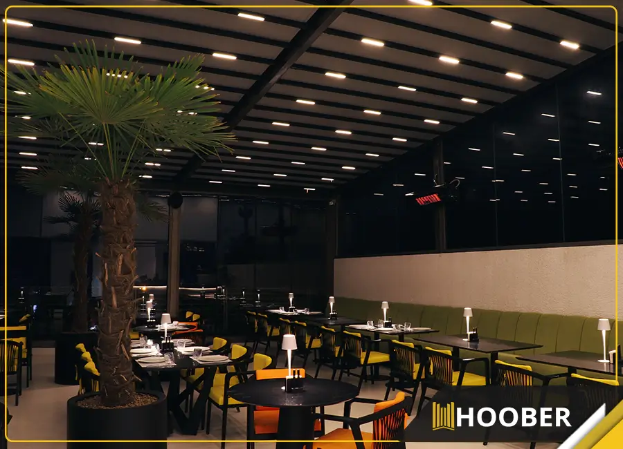 بسیاری از رستوران ها و کافیشاپ ها، از محوطه خارجی و فضای بیرونی ساختمان خود جهت سرو غذا و پذیرایی از مشتریان استفاده می کنند. وجود سقف برقی در چنین فضایی، می تواند محیط مناسبی را در شرایط گوناگون جوی همچون بارش باران و برف و یا تابش مستقیم نور خورشید در فصل تابستان فراهم آورده و سبب ایجاد محیطی دلنشین برای مشتریان شود. در طراحی و اجرای سقف برقی کافیشاپ نیز از متریال های بسیار با کیفیت و مقاومی استفاده شده و به صورت هوشمند نیز عمل می نماید.